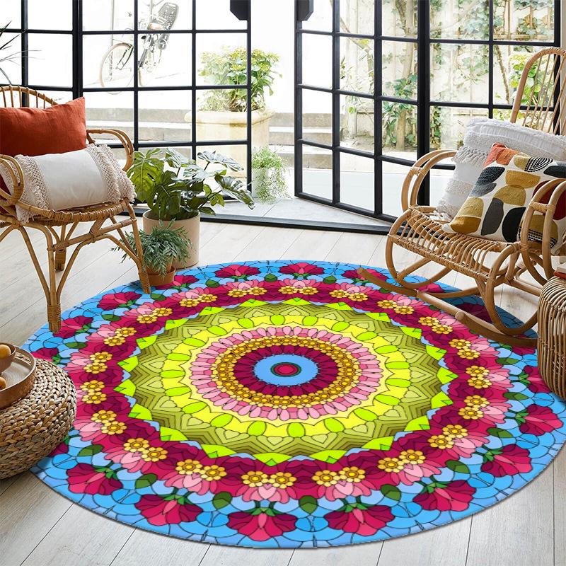 Boho Round Carpet Geometric Flower Design Anti-slip Floor Mat Ethnic Style Artistic Home Decor Rug for Living Room Lounge Office