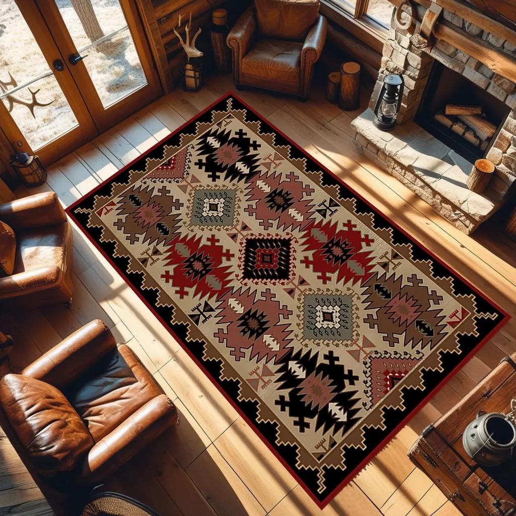 Southwestern Tribal Area Rug Aztec Rustic Area Rugs Native Geometric Rug, Non-Slip Indoor Floor Rugs for Bedroom Living Room