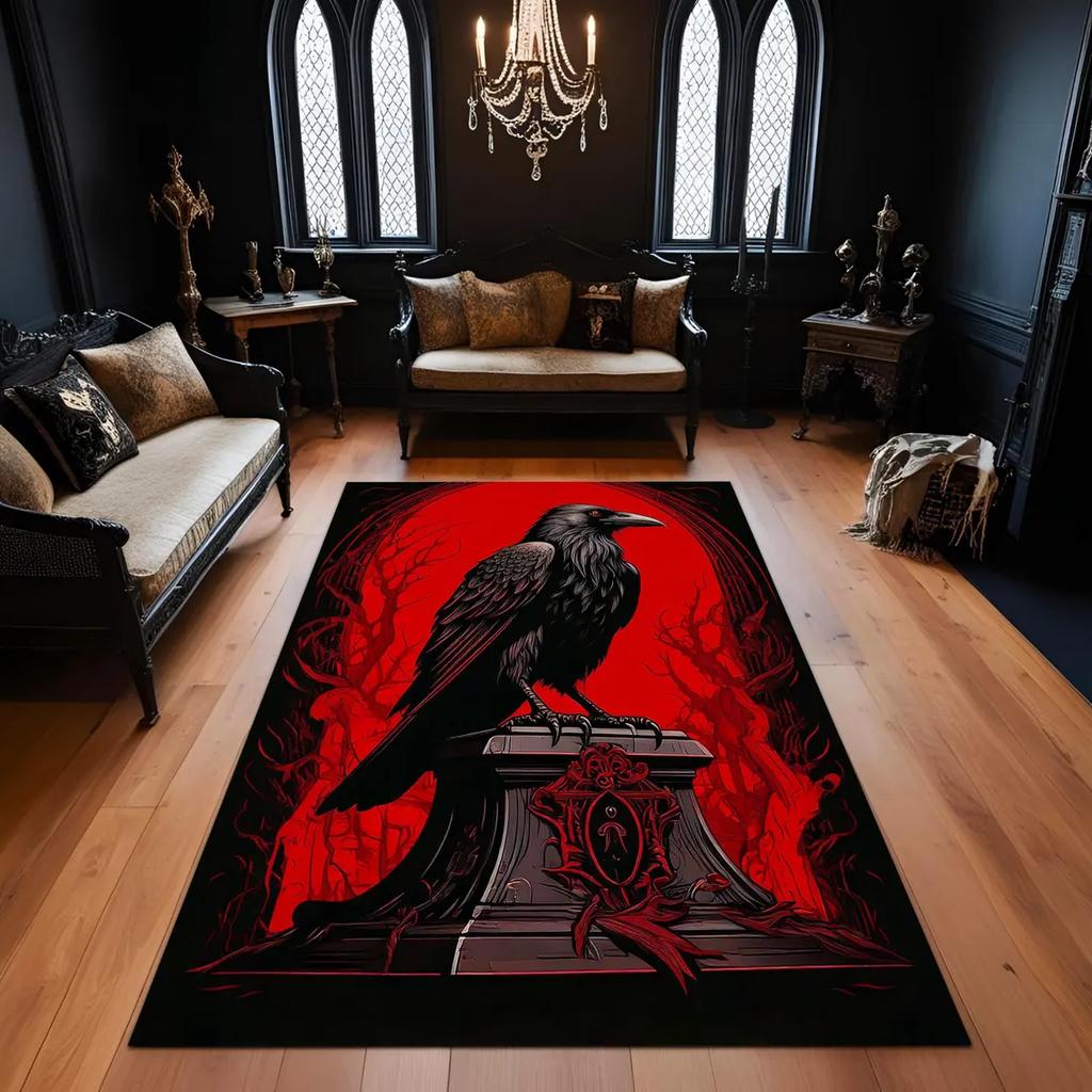 Gothic Raven Rug, Dark Floral Bird Carpet, Witchcore Crow Decor, Occult Animal Rug, Mystical Rose Art for Moody Rooms