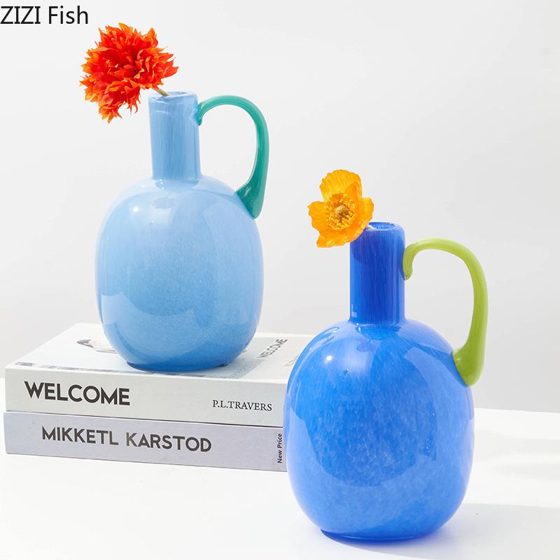 Single Handle Colorful Glass Vase Hydroponic Plant Pot Table Decoration Flower Arrangement Floral Vases Room Aesthetic Decor