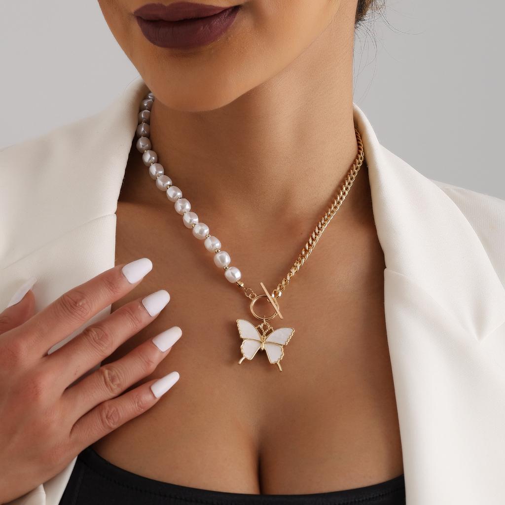 Foreign Trade Special Jewelry, Temperament Imitation Pearl Bead Splicing Aluminum Chain Necklace Jewelry, White Imitation Fritillary Butterfly