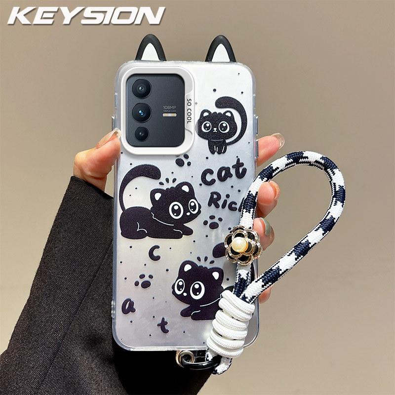 KEYSION Cute Ear Cartoon Case for VIVO V23 5G with Lanyard Soft Silicone+PC Shockproof Phone Back Cover for VIVO V23 5G