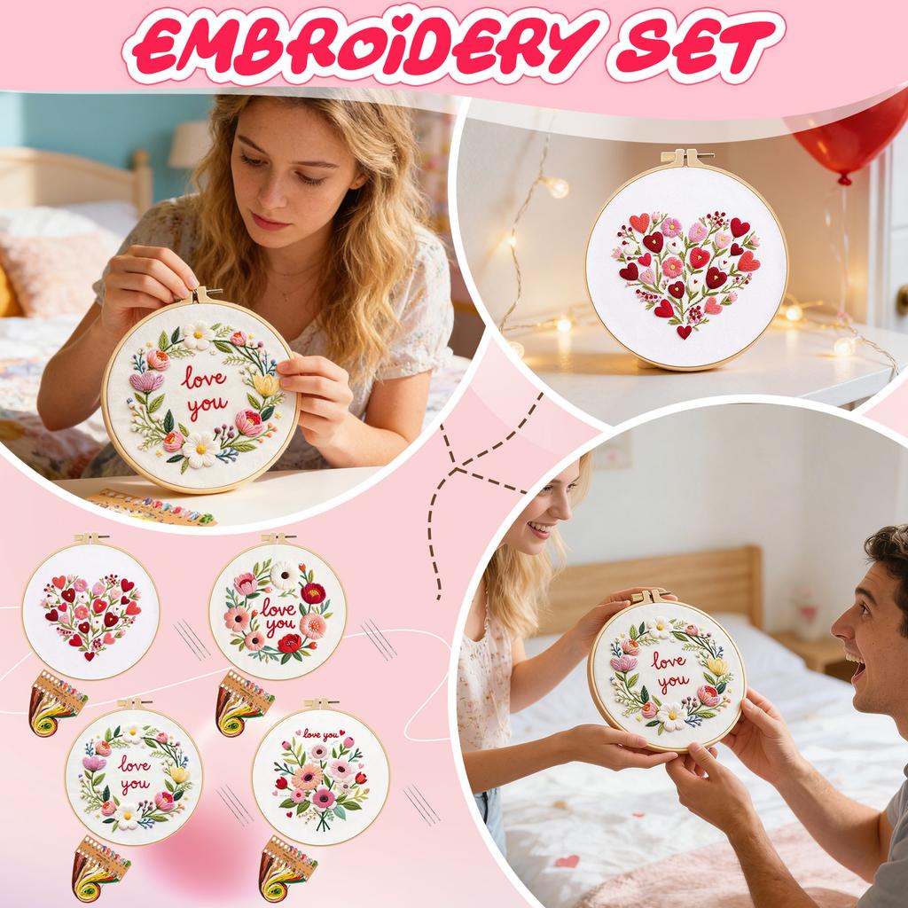 Valentine's Day Floral Embroidery DIY Craft Kit (Suitable For Beginners), 20cm - - Embroidery Hoop (Not A Pre-made 30cm Fabric Embroidery Hoop)
