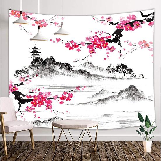 NYMB Japanese Anime Tapestry, Black and White Yin Yang Koi Fish Tapestry for Bedroom Aesthetic, Asian Wave Cherry Blossom Tapestries Poster Beach