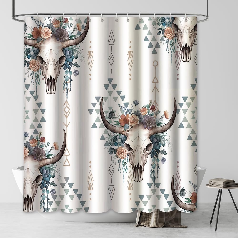MEHOFOND Boho Western Cow Skull Shower Curtain - Bull Skull Flower Head - Farmhouse Country - Waterproof Fabric - 72x72 Inch