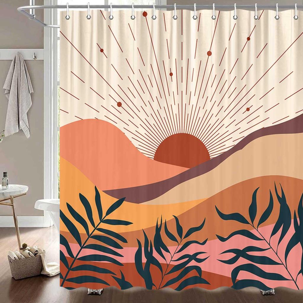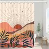 Boho Shower Curtain, Orange Bohemian Mid Century Modern Shower Curtain, Abstract Blue Leaves Plant Grey Minimalist Bathroom Decor Bath Curtain