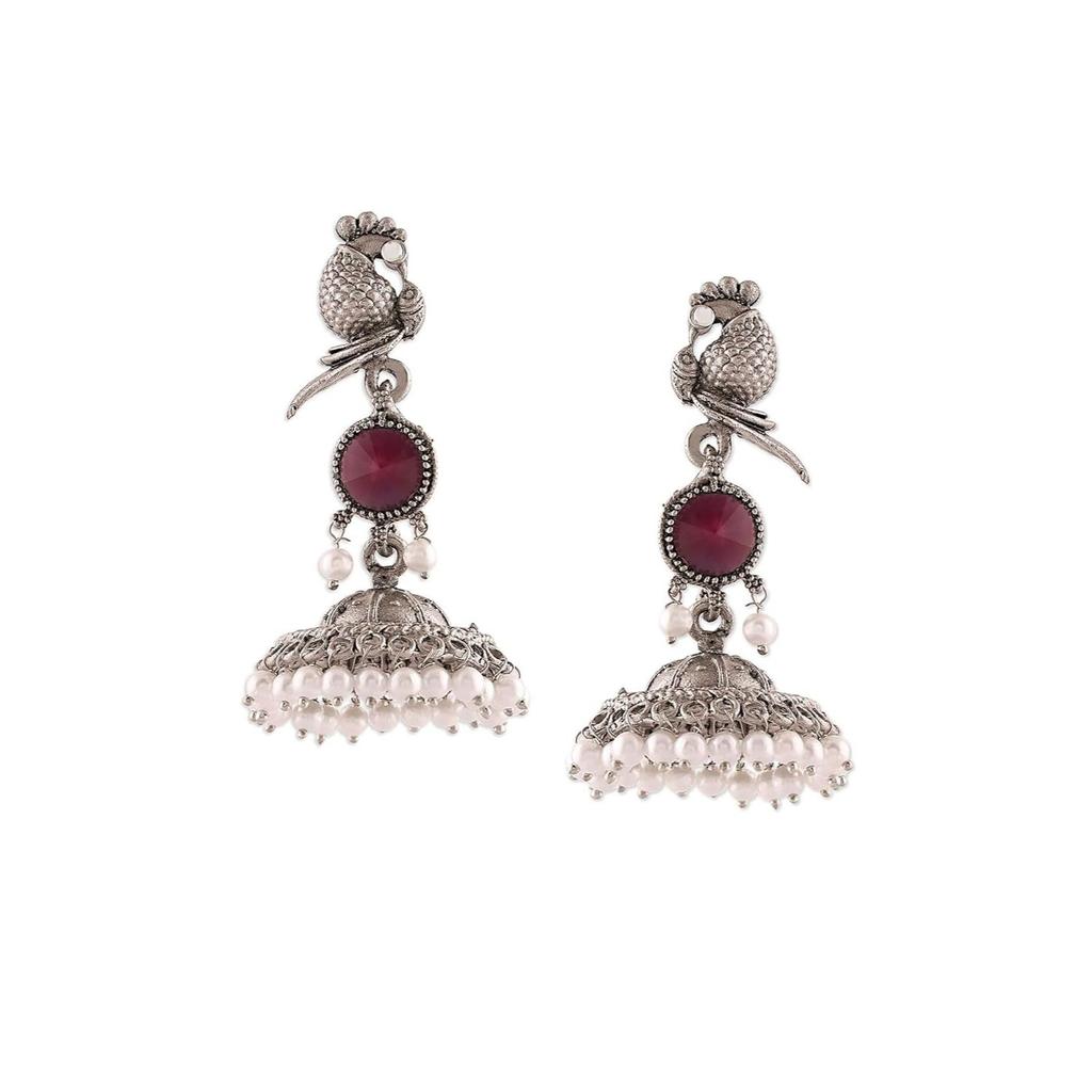 Purple Peacock Silver Oxidised Stones & Beads Traditional Jhumki Earring For Women