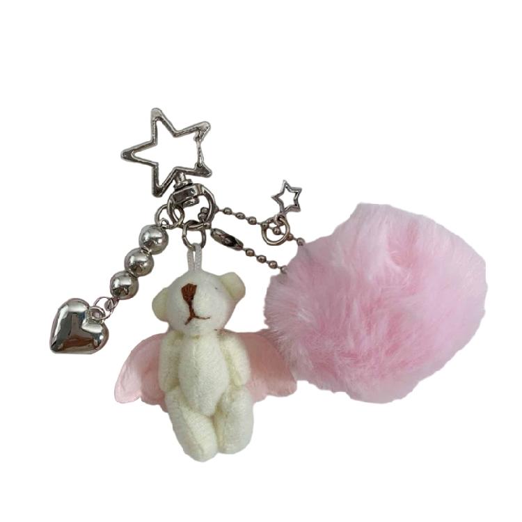 Pompoms Adorned Bear Keyring Plush Animal Keychain Pendant Handmade Phone Charm Unique Gift for Children and Teens