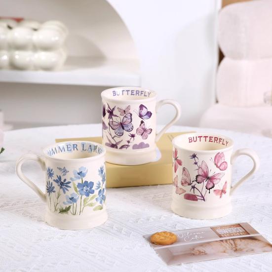 Crafted from high-quality ceramic, this coffee mug offers a warm, delicate texture that is both heat-resistant and durable, perfect for enjoying coffee, tea, hot milk, and other beverages daily. Its design blends classic country charm with medieval style elements, featuring elegant lines and English decorative text like "BUTTERFLY" and "FLOWER," evoking a nostalgic and cozy ambiance.