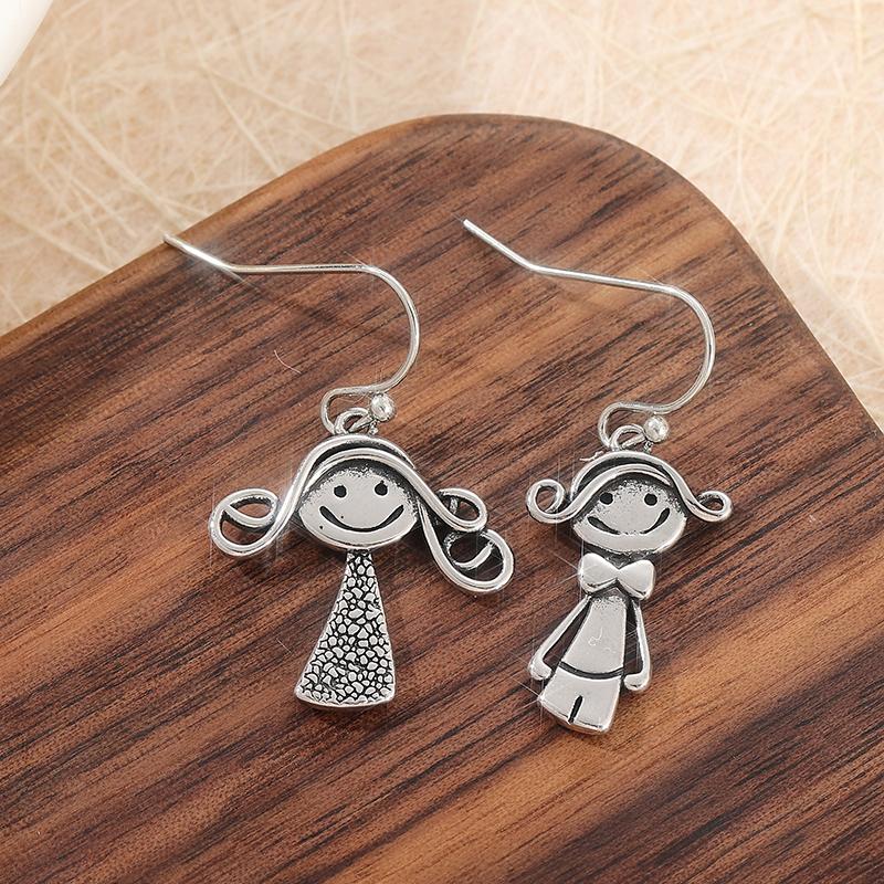 Vintage Silver Color Metal Carving Cute Small Couple Pattern Dangle Earrings for Women Jewelry