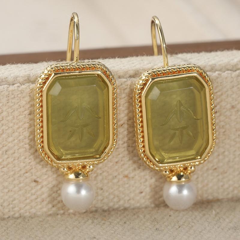 Vintage Inlaid Imitation Pearl Emerald Pendant Earrings for Women Elegant Exquisite Banquet Dangle Earrings Jewelry Accessories
