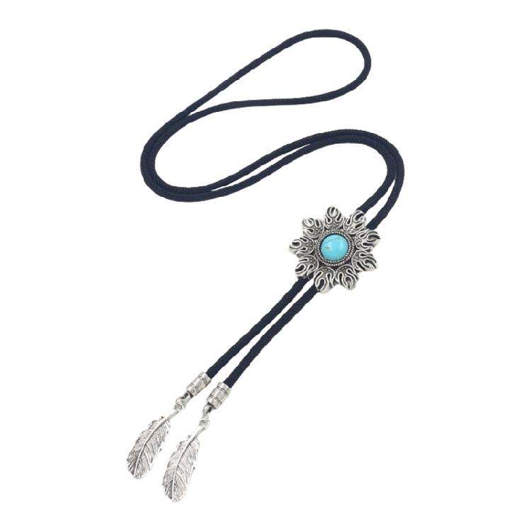 Unisex Western Cowboy Bolo Tie Vintage Sun Turquoises Stone Pendant Jewelry Braided Rope Necktie Metal Feather Necklace