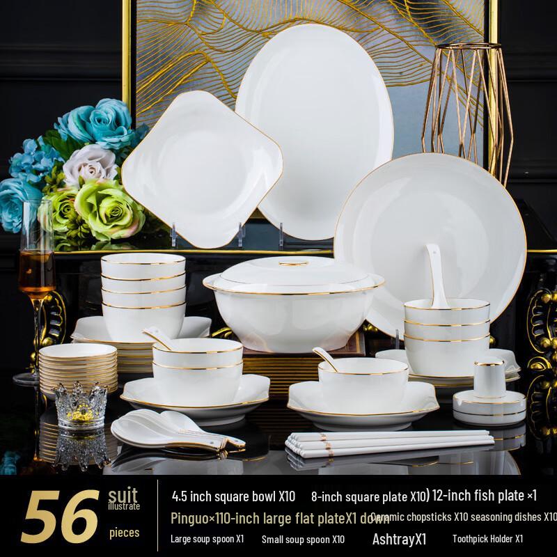 Ruhan Jingdezhen Gold-Rimmed Ceramic 56-Piece Square Dinnerware Set