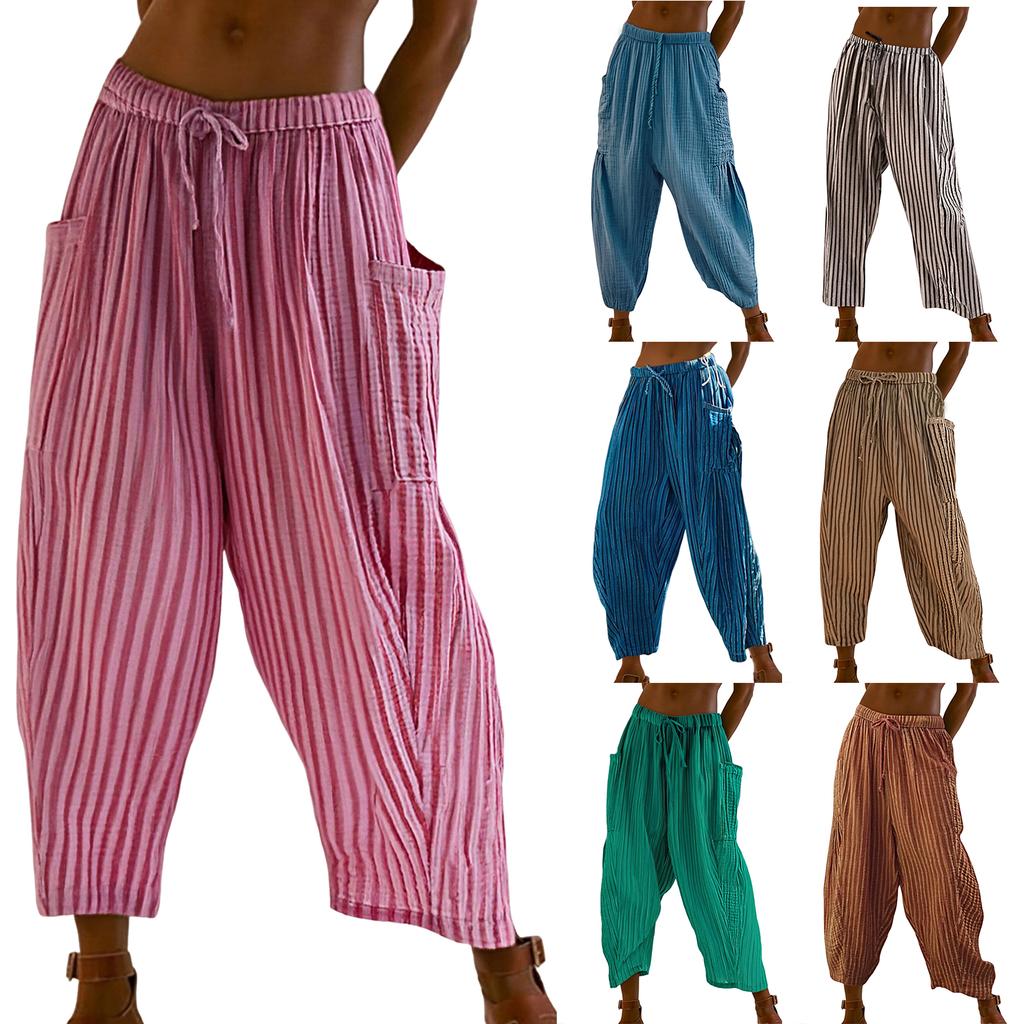 Women's Fashion Striped Straight,Leg Elasticated Waist Cropped Pleated Casual Trousers