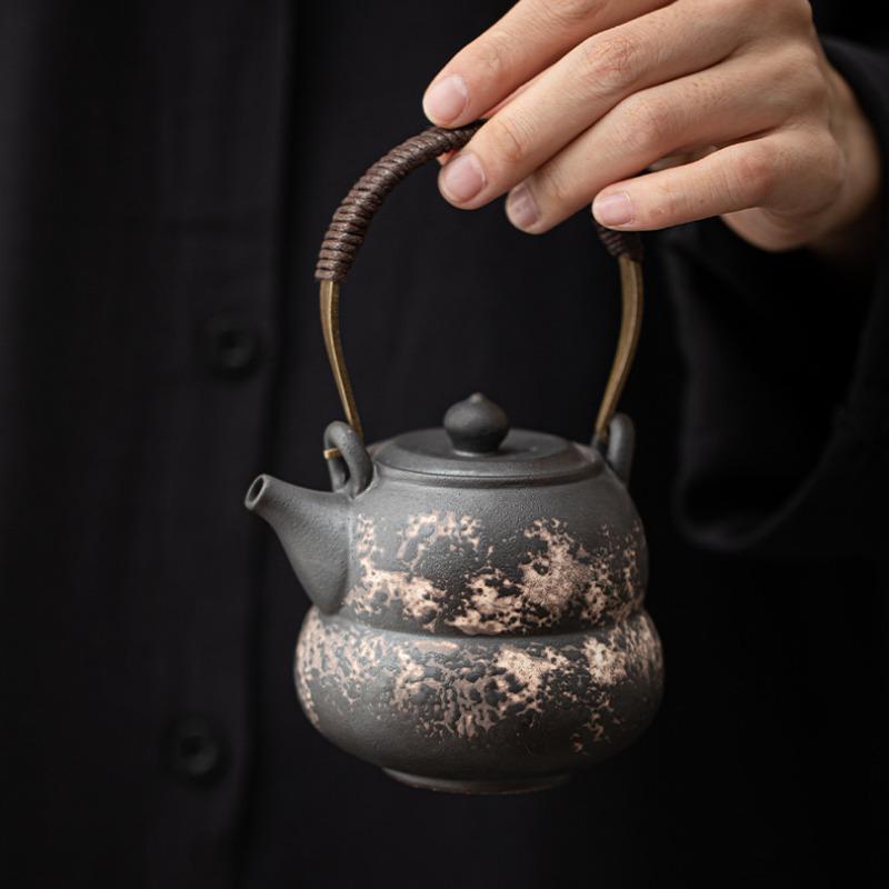 230ML Retro Black Pottery Gourd Lifting Handle Teapot Elegant Tea Infuser Pot Tea Maker Kettle with Filter Drinkware Ornaments