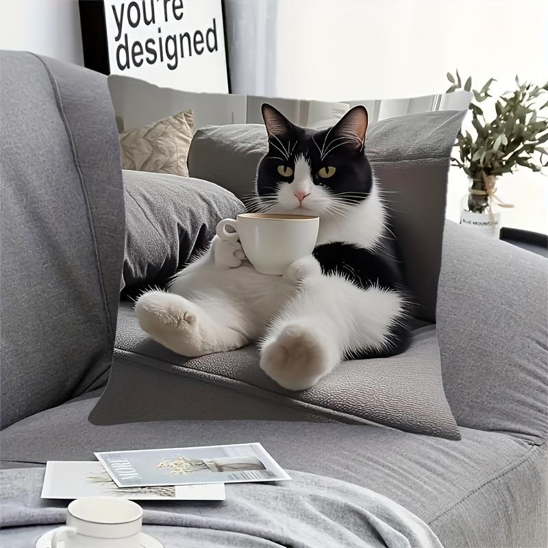 1 Piece Black and White Cat Single-sided Printed Short Plush Pillowcase - Soft Polyester Decorative Pillowcase