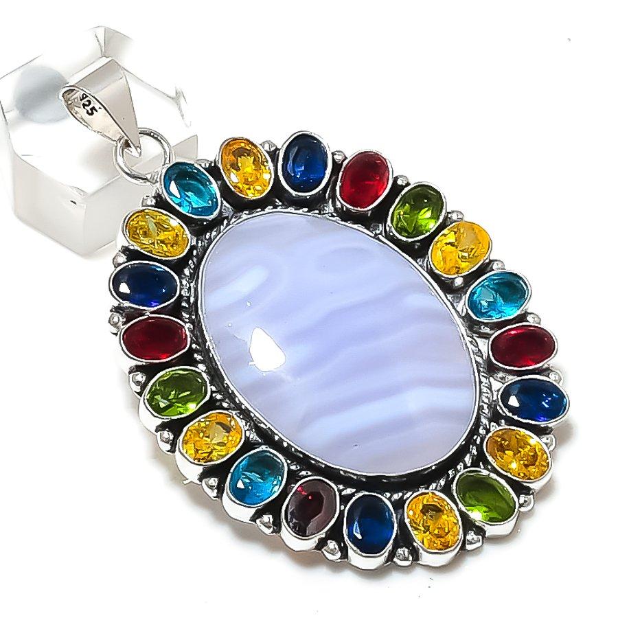 Natural Blue Lace Agate Gemstone 925 Sterling Silver Jewelry Pendant 2.64" ETC-13775