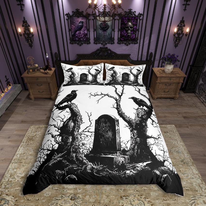 Homewish Gothic Theme Duvet Cover SetSpooky Halloween Comforter Cover SetBlack Crown Birds Bed Set For Boys Teens