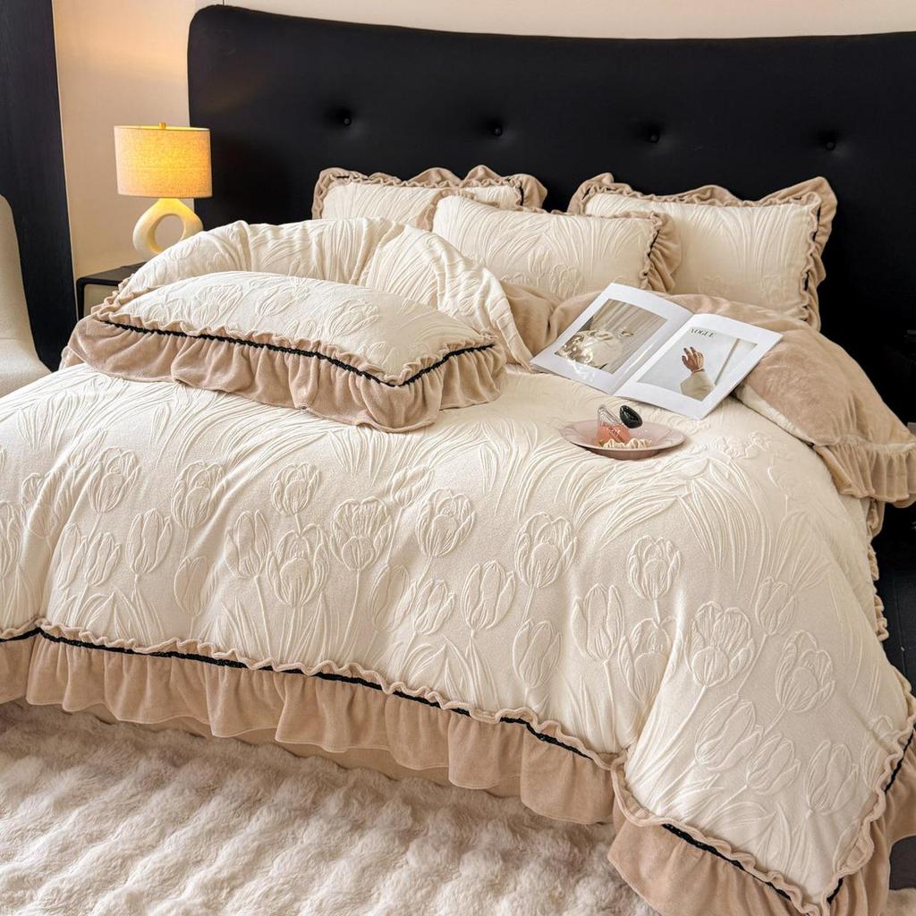 Luxury Carved Velvet Ribbon Lace Four-Piece Set: Double-Sided Fleece Duvet Cover for Cozy Home Warmth