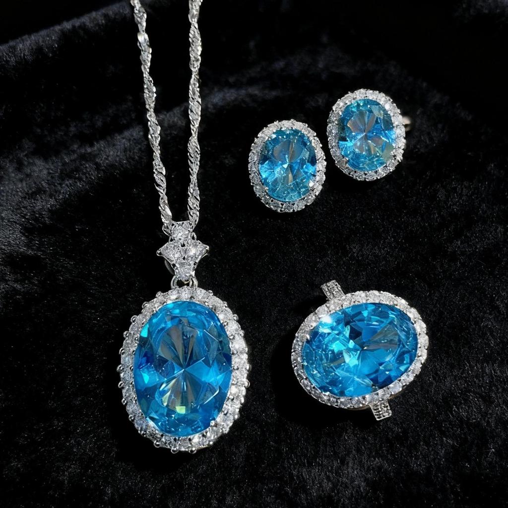 Ocean Blue Oval Jewelry Set: Elegant Three-Piece Necklace, Earrings & Ring for Any Occasion