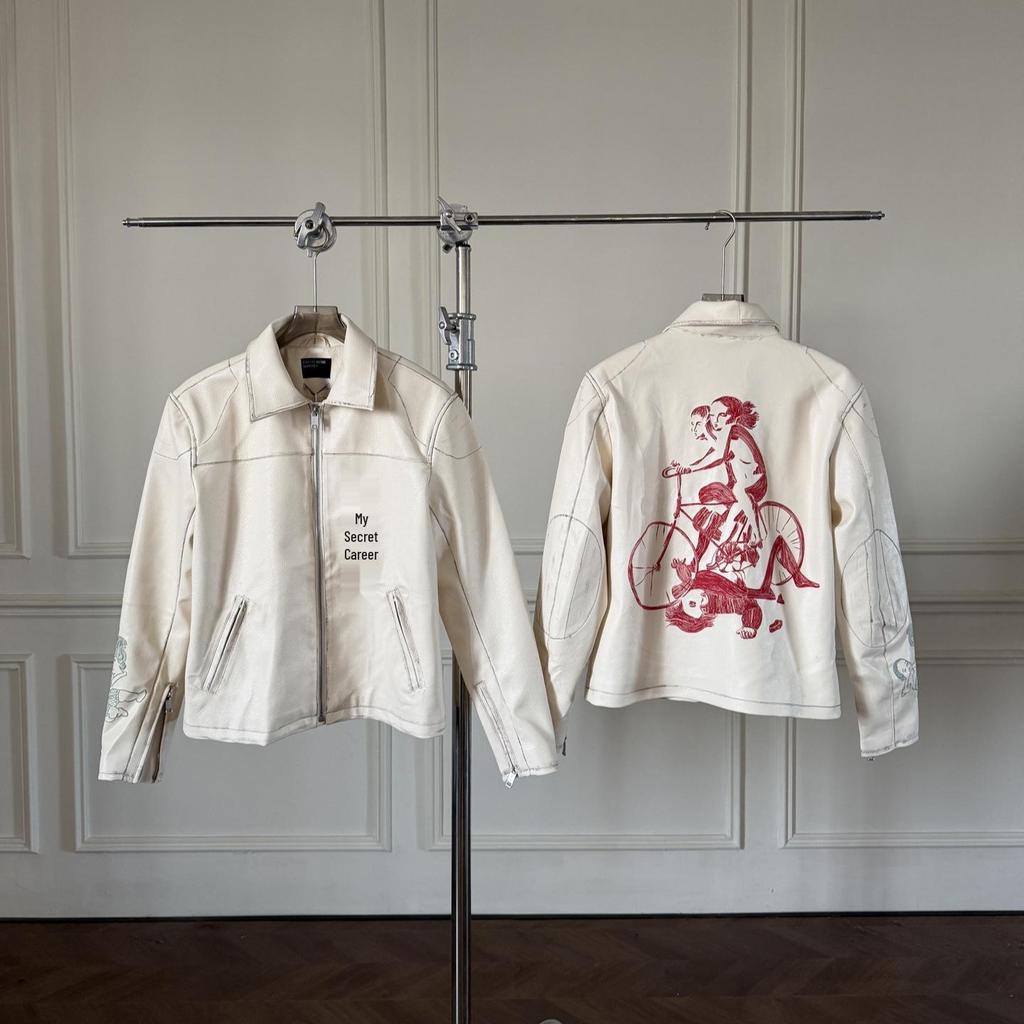 RICH KIDS 25SS Red "Bicycle" Embroidered Leather Jacket for Men & Women