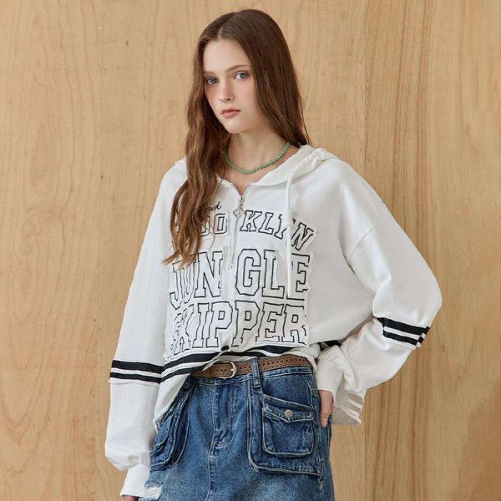 The MAZYA Lettering Distressed Hoodie T-Shirt ZE10QT001NA is a half-zip hoodie that creates a vintage mood. With lettering embroidery and distressed details, it gives a stylish impression. The natural finish of the hem adds a casual and relaxed atmosphere, and the loose fit silhouette makes it a trendy and stylish item.