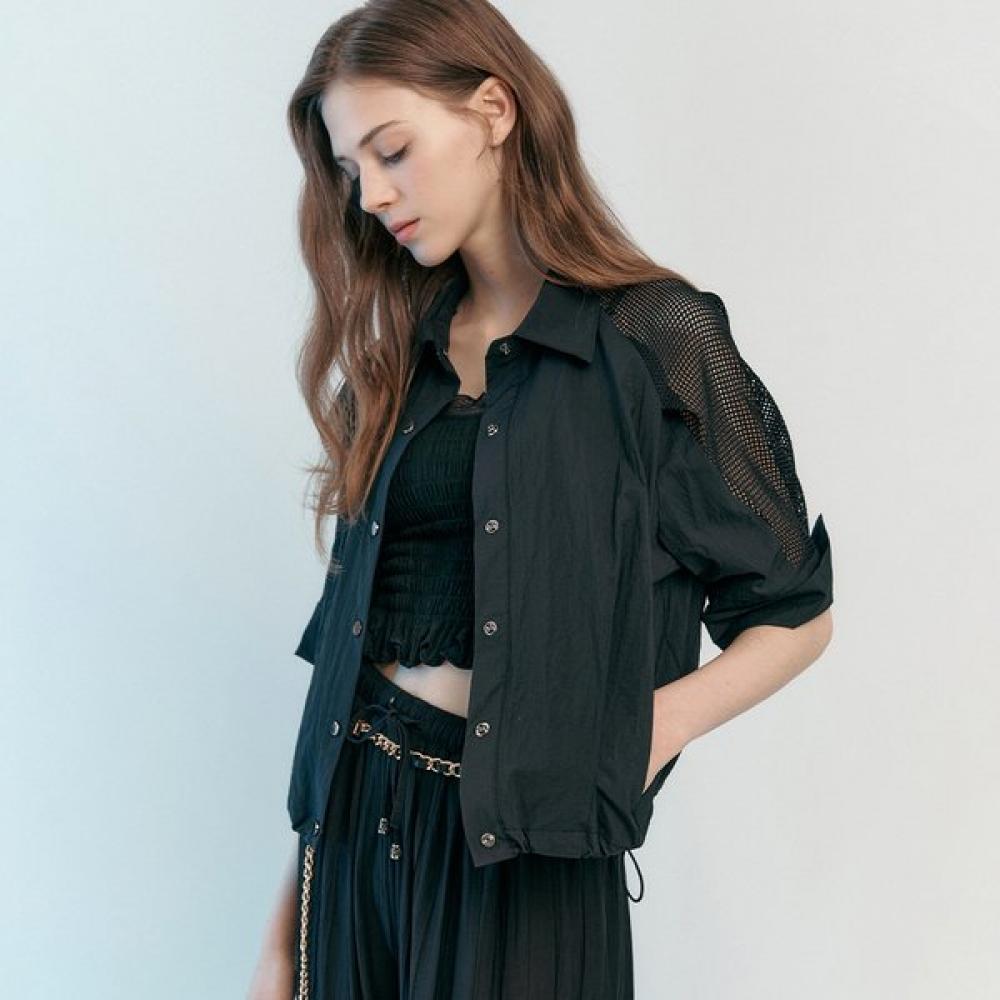 The Majah Mesh Block String Blouse-Type Jacket ZC09QJ600ON features a light and thin nylon-blend material and a distinctive mesh block detail on the shoulder. It's designed with snap buttons and a string to adjust the silhouette, making it a great item that can be easily layered over various looks.