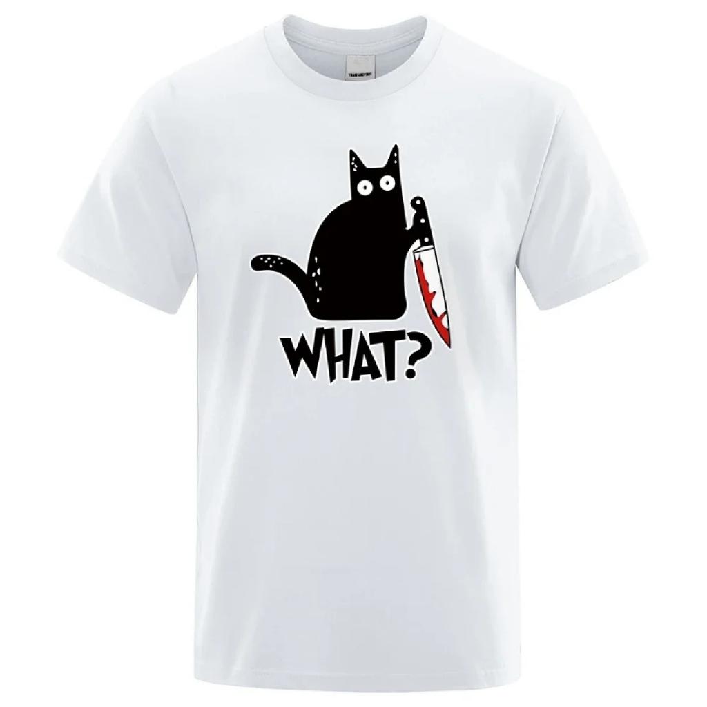Funny Knife Cat Cartoon Printed T-Shirt Men Fashion Casual Short Sleeves Loose Oversized Cotton T -shirts Summer Breathable Tees