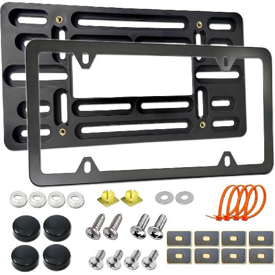 Aootf Front License Plate Mounting Kit- License Plate Bracket & Black Aluminum Car Tag Holder Cover Fit No Drilling Hole Front Bumper, Universal