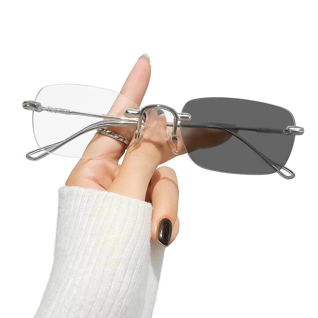 Korean Rimless Photochromic Sunglasses with Polarized Lenses and UV Protection [88flix] Color-Changing (Silver)