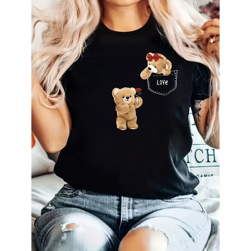 European Size Women's Casual Short Sleeve T-Shirt with Cartoon Teddy Bear & LOVE Pocket Print - Soft Stretch Round Neck Top, All-Season Comfort