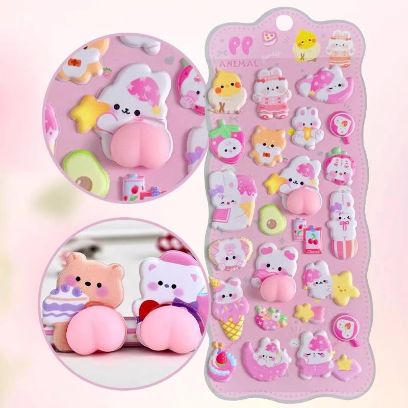 This set of four squishy butt stickers features 3D designs of popular animal characters, including rabbits, dogs, bears, and birds. The translucent material and soft pastel colors will add a touch of elegance to your planner or diary. The 3D design features raised buttocks and bodies, creating a soft, bouncy, marshmallow-like texture when touched with your fingers. Their squishy texture is soothing to both look at and touch. They make perfect birthday presents, small gifts, or rewards for children, and can also be enjoyed by sharing or exchanging with friends. Adding them to letters or gift wrapping will bring a smile to the recipient's face. This set is perfect for decorating planners, diaries, and notebooks, as well as for DIY projects.