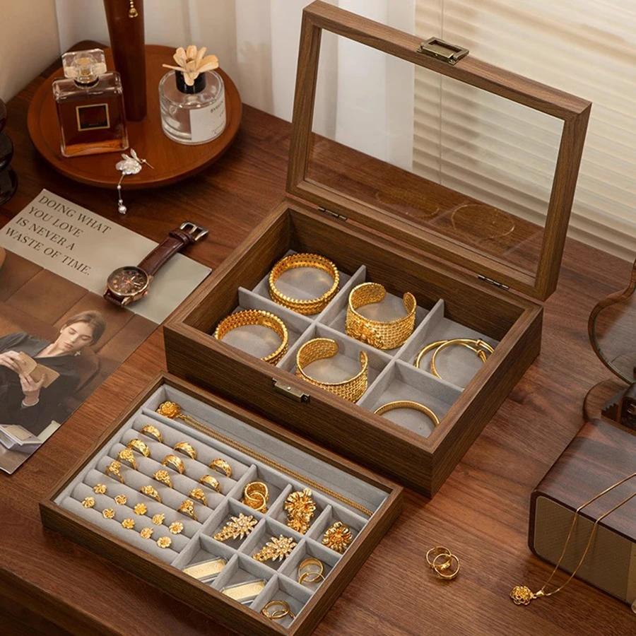 Walnut Color Double-decker Jewelry Box Necklace Earrings Box Cover Carry Oxide Jewelry Delicate Solid Wood Jewelry Box