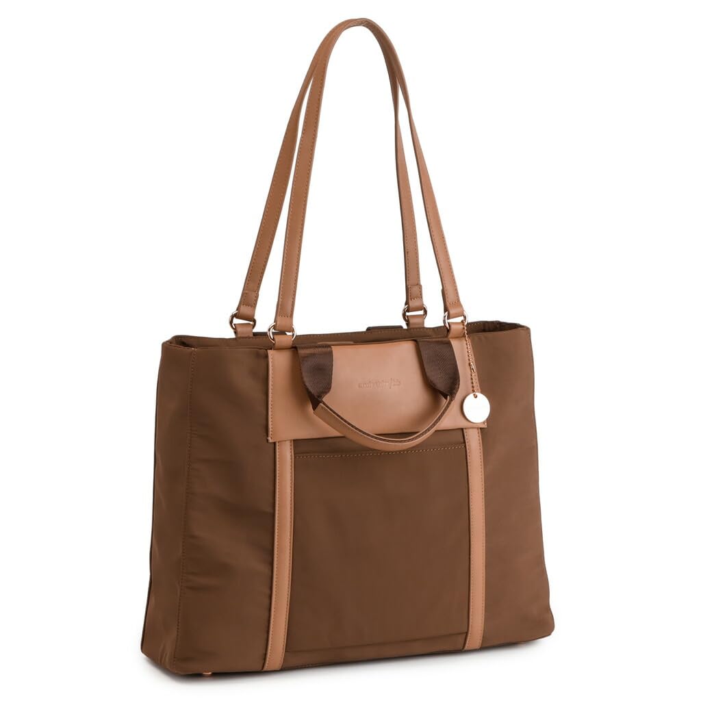 This lightweight tote bag features an elegant combination of synthetic leather and nylon. Its signature Marie Claire coin charm adds a touch of style. It features a double zipper and numerous pockets on the front and back. It's also a functional everyday bag. It's versatile enough for commuting, business trips, shopping, as a mom bag, or for travel. The long, soft synthetic leather handle allows for shoulder carrying, while the shorter handle is made of nylon tape and synthetic leather for carrying by hand.