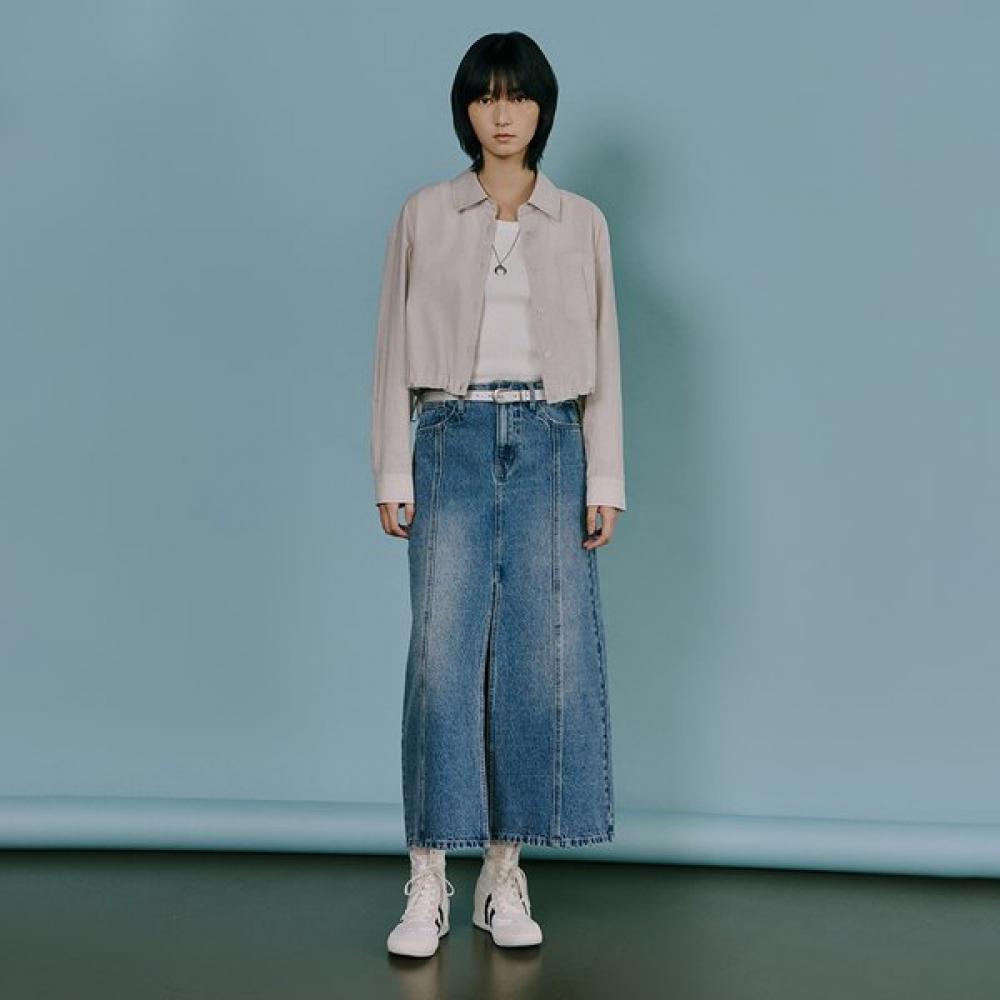 The Cut-off Waist Washing Slit Skirt AS1DS261 features a sophisticated indigo color and a minimal slit design, making it suitable for various styling options. It offers a comfortable fit and can create diverse casual looks.