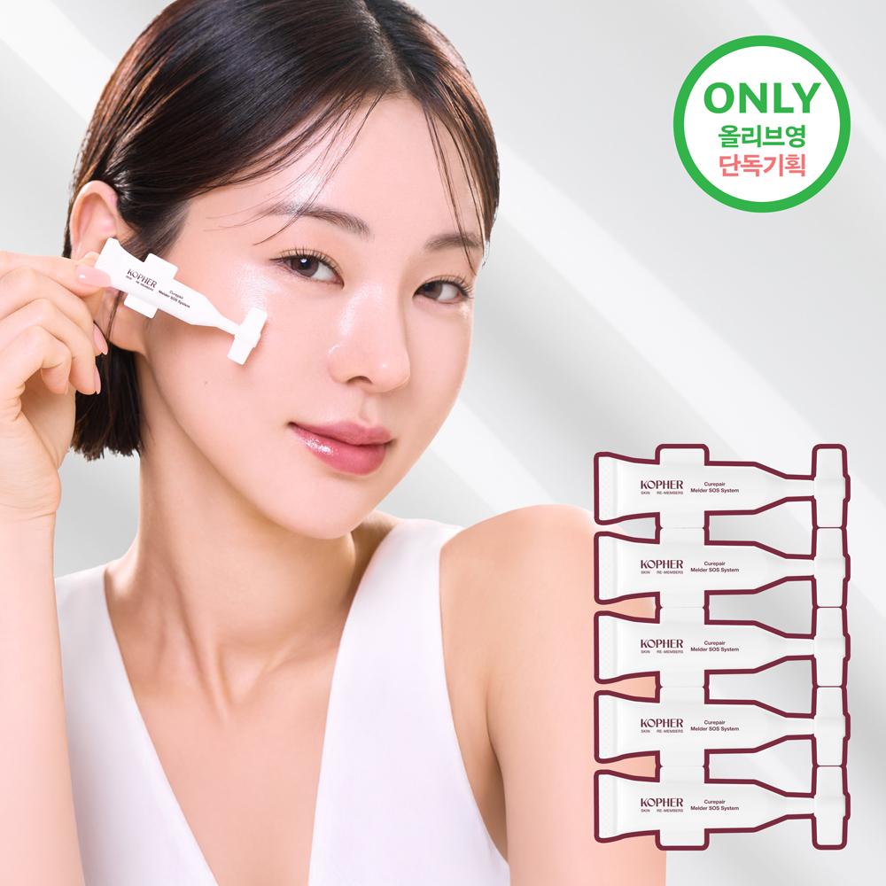 Coper Curirepair Melder SOS System 5 Pack (1.5ml*5ea) consists of a derma ampoule and melanin cream, suitable for all skin types. The combination of natural extracts and patented ingredients offers antibacterial effects and skin barrier strengthening. This product provides anti-aging and anti-inflammatory benefits while promoting skin microbiome regulation and soothing effects.