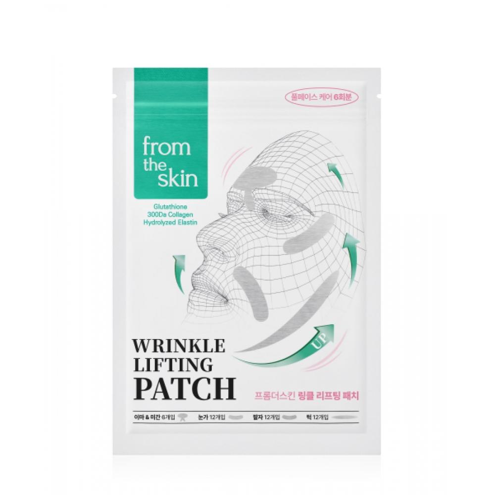 FROM THE SKIN Wrinkle Lifting Patch for Forehead & between Brows 24 pieces is a targeted patch mask for forehead and brow wrinkles. This product provides physical support and effective ingredients to prevent wrinkle folding and improve skin elasticity. With collagen included, it allows intensive wrinkle care and features a thick and elongated design suitable for specific areas. The package contains patches that can cover the entire forehead and mechanisms for brow lifting, comprising a total of 24 use.