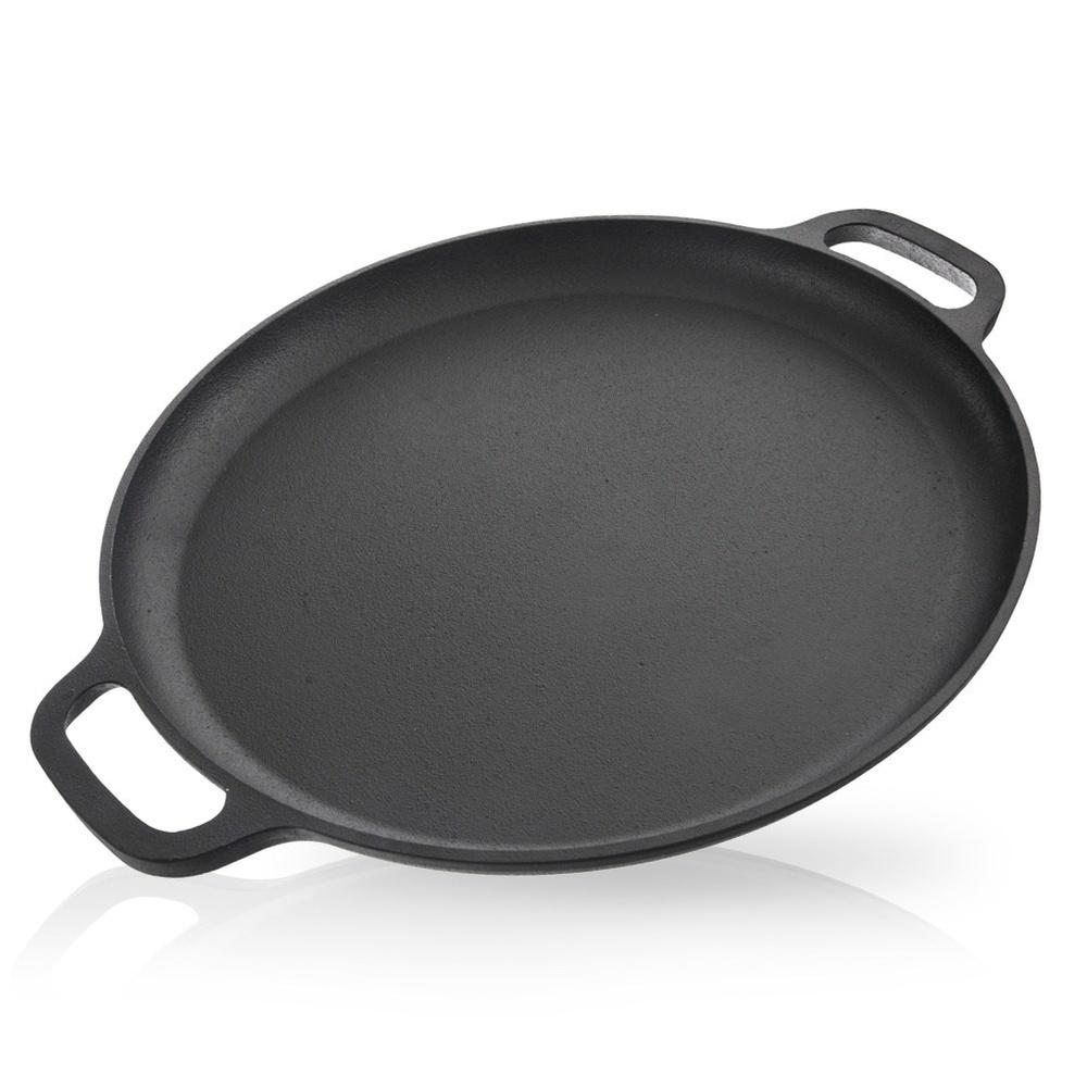 Okrągła patelnia żeliwna idealna do przygotowywania różnego rodzaju potraw. Wyposażona w wygodne uchwyty. Patelnia zapewnia szybkie i jednolite smażenie. Możemy użytkować ją w każdej kuchence, ale również bezpośrednio na grillu, czy ogniu. Patelnia jest niezwykle solidna i ciężka. Żeliwo rozgrzewa się równomiernie i długo utrzymuje ciepło, dzięki czemu serwowane dania dłużej będą ciepłe.