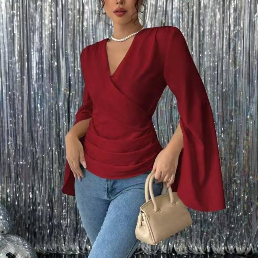 This elegant top is designed for the fashion-forward individual looking for a sophisticated addition to their autumn wardrobe. Crafted from high-quality polyester fiber, it features a solid pattern that adds a touch of timeless charm. The v-neckline gracefully complements the cross-neck design, while the long, split flare sleeves bring a hint of drama and movement to the piece. The quilted decoration adds a layer of texture, enhancing the overall appeal of the top. Perfect for adding style and elegance to any outfit, this piece is a must-have for the autumn season.