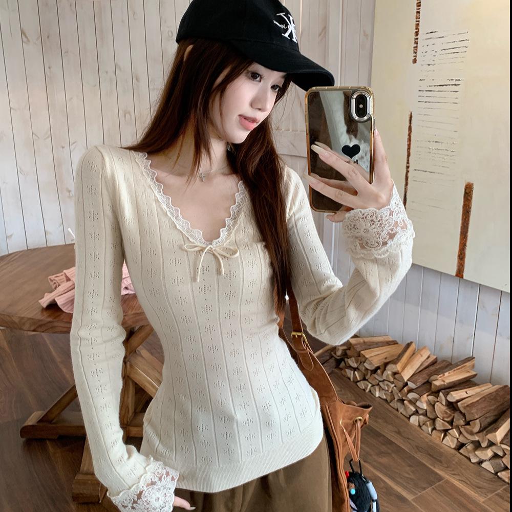 Elegant Lace Trim V-Neck Long-Sleeve Women's T-shirt - Slimming, Waist-Cinching Base Layer for Autumn/Winter, Perfect for Instagram.