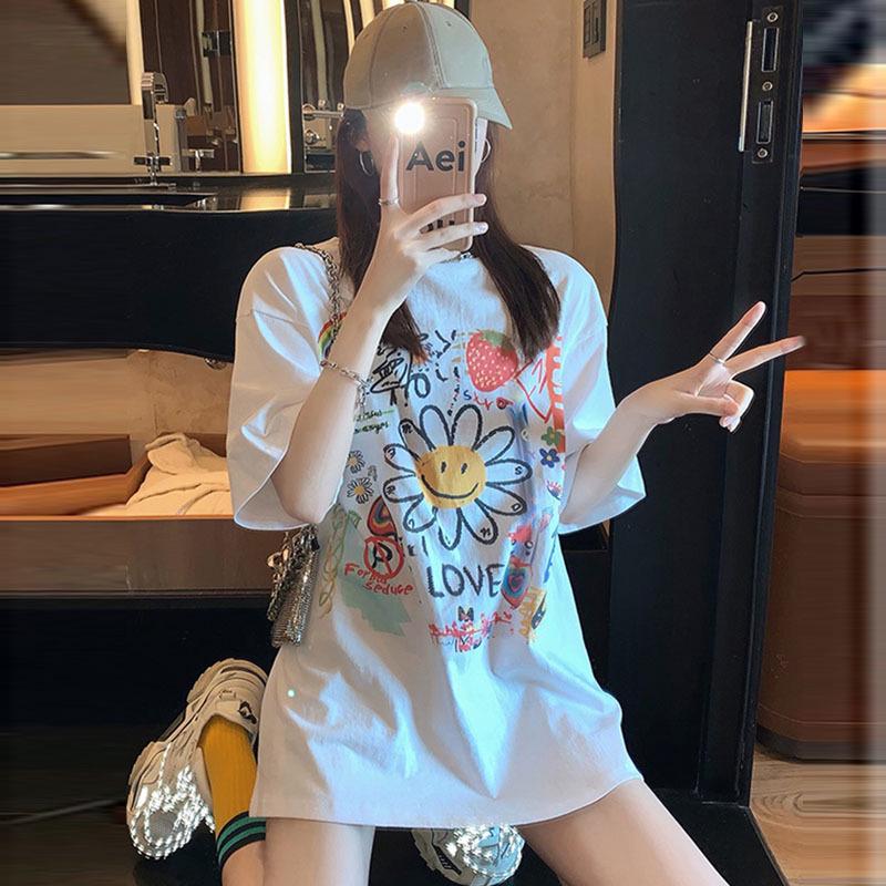 Summer 2026 Korean Style Trendy Cute Graffiti Loose Mid-Length Short-Sleeve T-shirt for Women