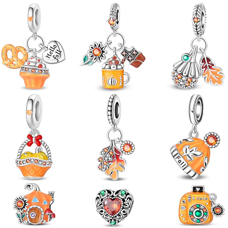 Original S925 Silver Plated Autumn Maple Leaf Pumpkin Camera Charm Beads Fit DIY Bracelet Fine Birthday Jewelry Gifts