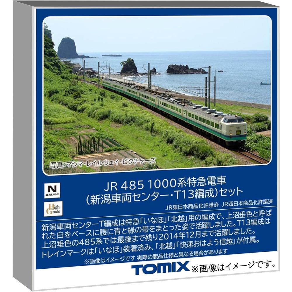 The TOMYTEC Tomix N gauge JR 485 1000 series Niigata Railroad Center T13 formation set model train features a high-grade (HG) specification, replicating the T13 formation. The body is produced in upgraded colors and maintains a level of detail that closely resembles the real train. It includes various functions that allow for an enjoyable operating experience like a real train.