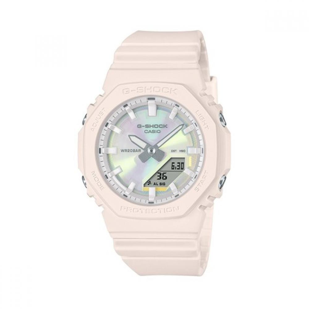 The GMA-P2100 series is appealing for its small size and simple design. The polarization color dial captures the sparkle of the intense summer sea and shows various colors depending on the angle. The indices have a gloss coating that harmonizes with the dial, while the matte texture of the bezel and band enhances the distinctive colors. Additionally, the use of biomass plastic embodies a sustainable design that considers the environment, making it a stylish point item that completes street fashion.
