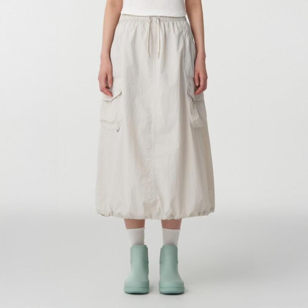 The women's cargo long skirt features comfortable wearability with waistband shirring and stretching, allowing for volume adjustment at the hem with a string. It includes an practical out-pocket design and snap buttons on the left and right hand pockets for secure storage of your belongings. The comfortable fit is enhanced with a waist adjustment string and waistband, while the silhouette can be adjusted via the hem string. The use of mesh fabric ensures breathability and prevents transparency, making it suitable for summer wear.