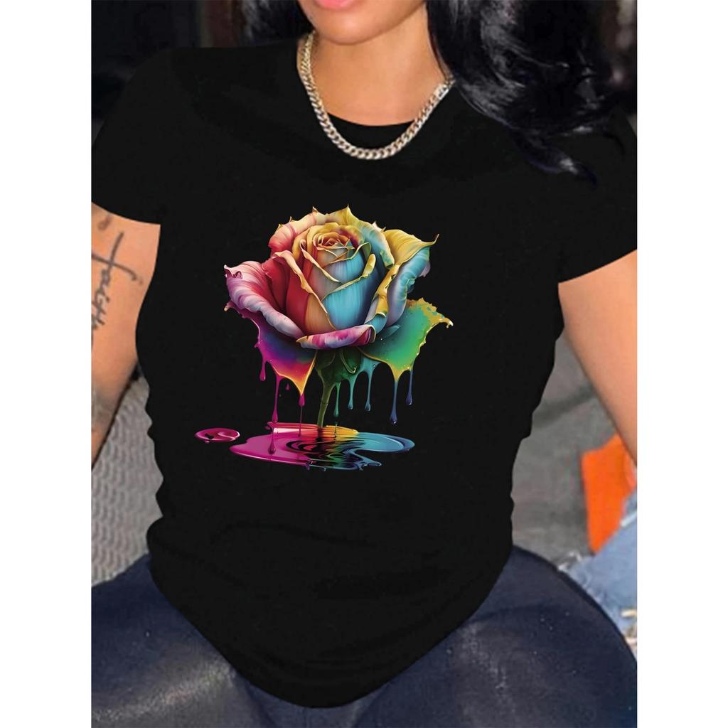 Flower Pattern Print T-shirt Short Sleeve Crew Neck Casual Top for Summer & Spring Women's Clothing