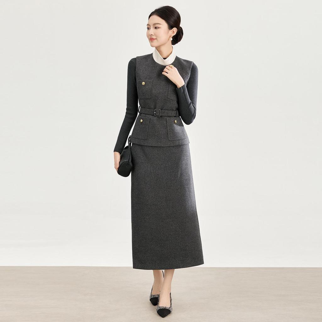 Elevate your wardrobe with this sophisticated three-piece set, featuring a wool blend vest and a stretch knit skirt. Designed with a solid pattern and stylish patchwork and quilted decorations, this ensemble offers a touch of elegance with a sportive flair. The main fabric comprises a luxurious blend of wool, complemented by a stretchy knit base layer to ensure comfort and versatility. Perfect for adding a layer of sophistication to your casual outings or dressed-down office days.