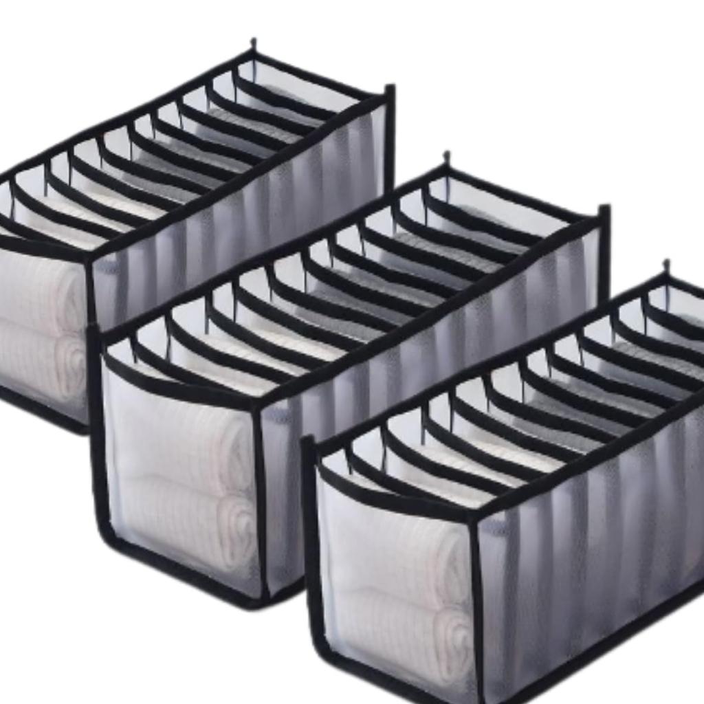 Clothing Storage Boxes - Set of 3: Divided Storage to Transform Drawers This set of three storage boxes helps organize cluttered drawers, making daily clothing selection more convenient. These boxes are specifically designed for small items such as socks, underwear, ties, and handkerchiefs. The main body measures 12cm wide x 12cm high x 32cm deep and features 11 dividers with 2.9cm wide pockets, giving each garment a designated place. This makes it easy to see what's where when you open the drawer. Even during busy mornings, you can easily find what you need without hesitation. 【Excellent Breathability for Cleanliness】 The main body uses a highly breathable mesh material. Because moisture doesn't easily accumulate, it prevents mold growth on your valuable clothing, keeping it clean at all times. 【Washable for Hygiene】 Cleanliness is crucial for boxes that store delicate clothing. These storage boxes are completely washable, so you can easily wash them and use them hygienically whenever you notice any odors or stains. 【Space-saving foldable design】When not in use, it can be easily folded and stored compactly, saving space. It's also convenient when changing clothes for the season.