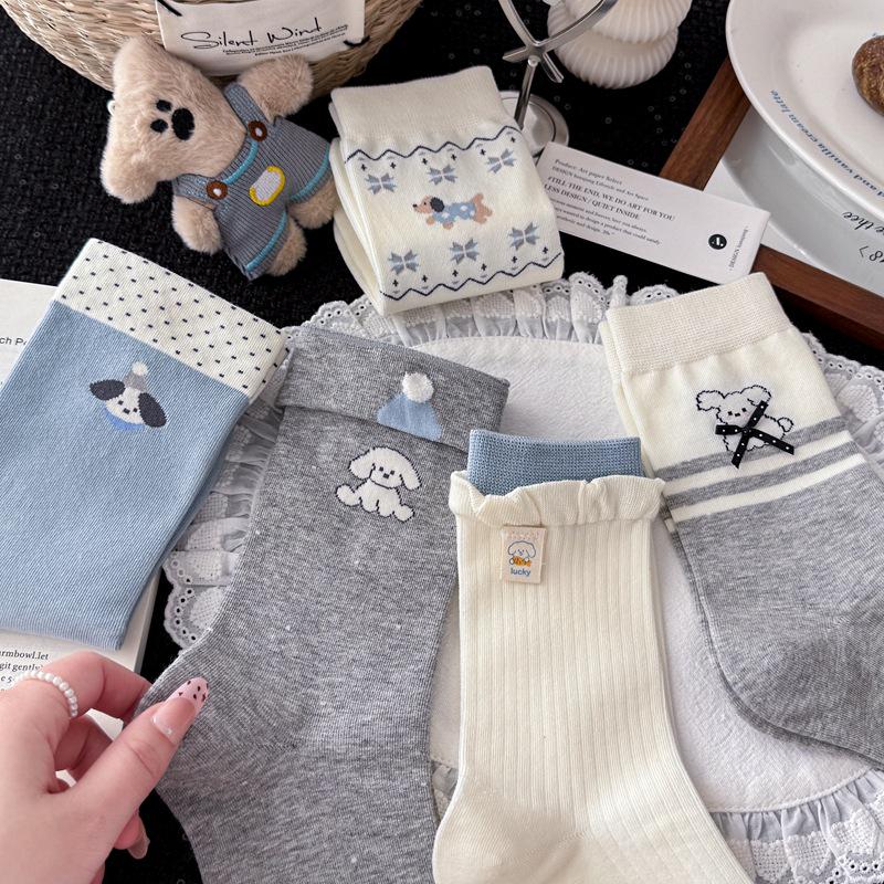 Korean Blue-Gray Striped Mid-Calf Socks - Women's Combed Cotton, Cute Puppy Design