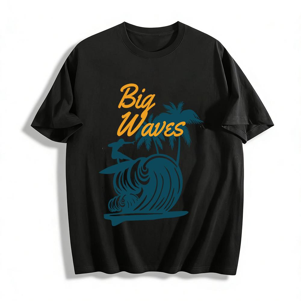 Big Waves Surfing Print Casual Tee Coconut Tree Beach Vacation Top Pure Cotton T-shirt